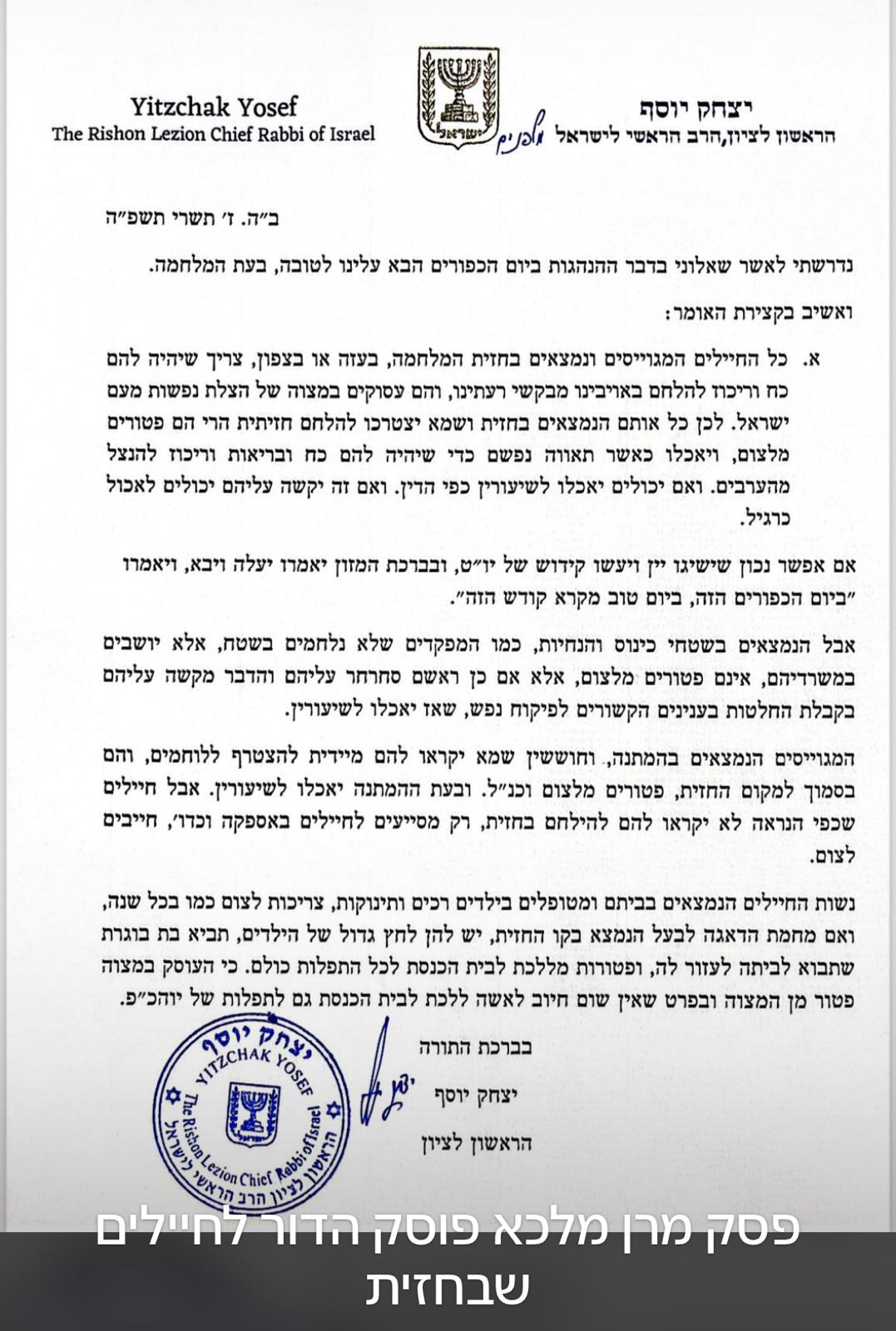 פסק הלכה לחיילים במלחמת חרבות ברזל ביום כיפור