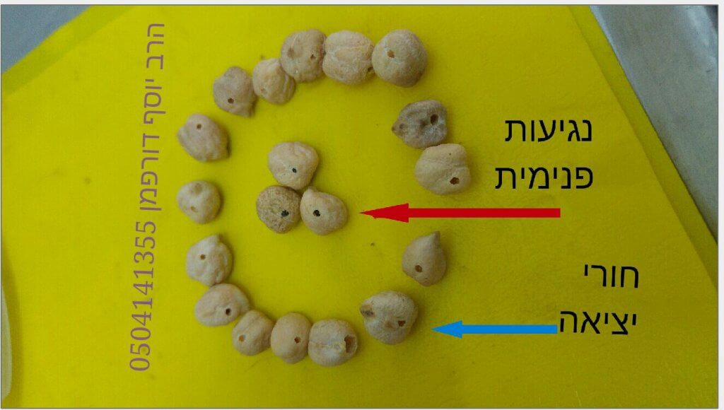 בתמונה רואים נגיעות בחומוס, בתוך העיגול ישנם גרגירים שיש בתוכם חרקים ובחלק החיצון רואים חורי יציאה של החרקים, בדיקת החומוס היא כך: